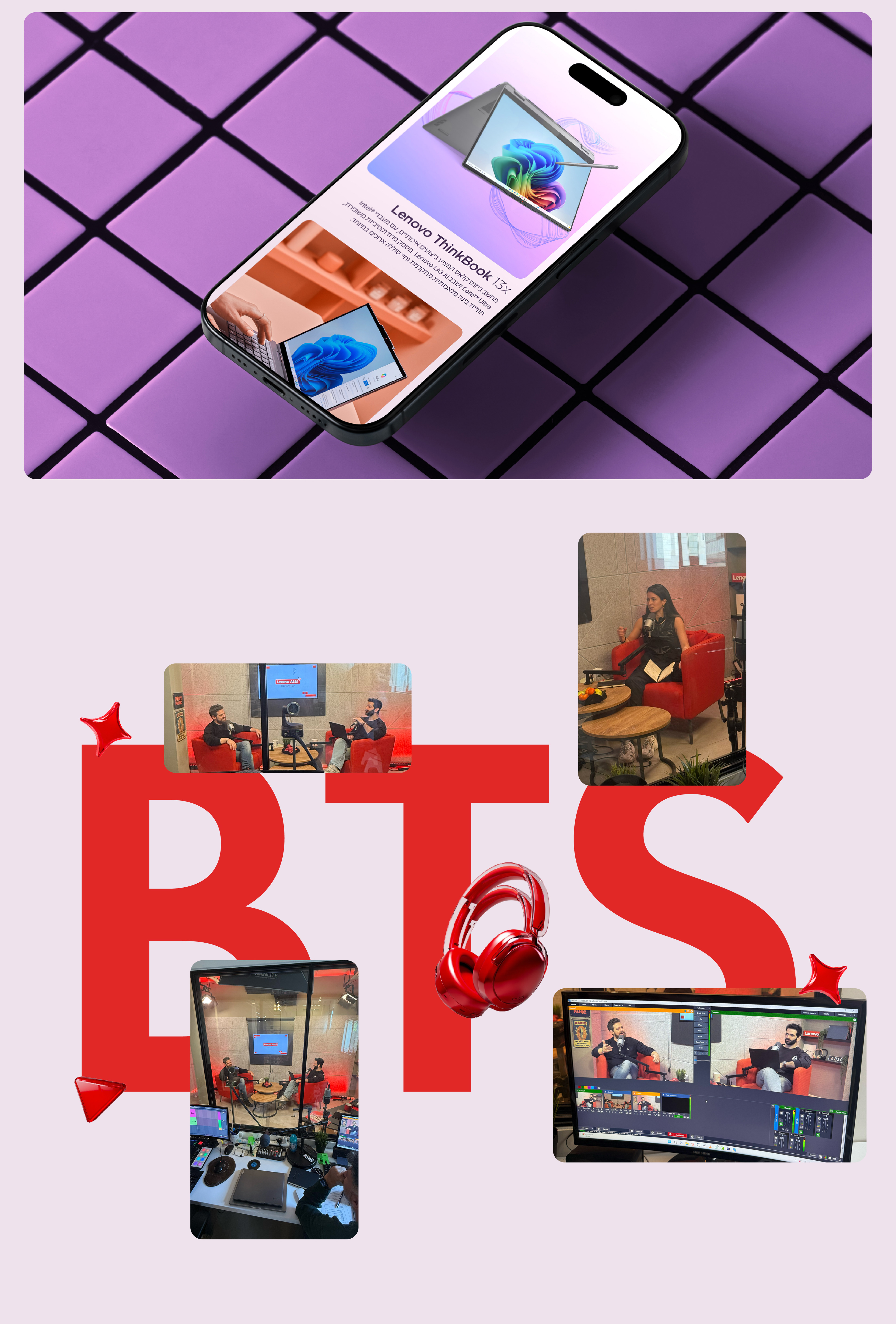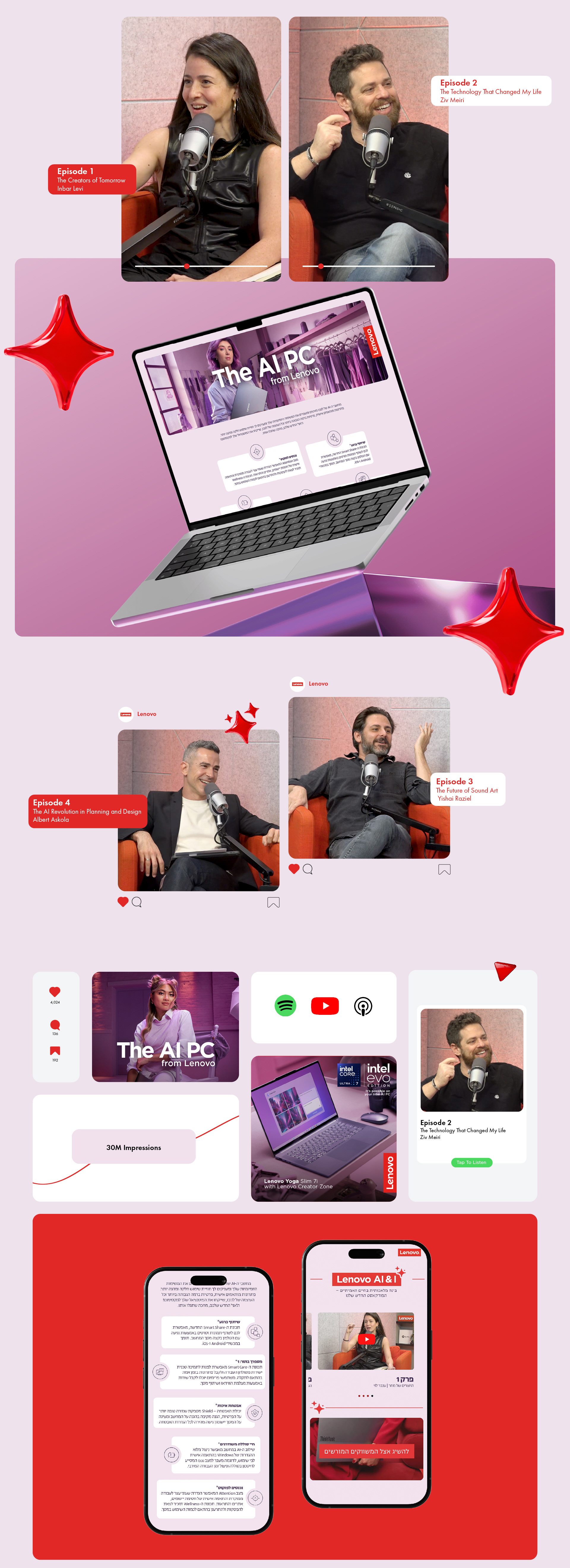 In this project, I led end-to-end development and production of Lenovo’s flagship podcast - AI & I, an original series exploring how artificial intelligence is transforming not just technology, but the way we think, create, and communicate. The podcast was hosted by Or Botbol and featured thought leaders from the worlds of AI creativity, architecture, sound, and advertising – including Inbar Levy, Ziv Meiri, Yishai Raziel, and Albert Askola - engaging in intimate conversations about the intersection of humans and machines.